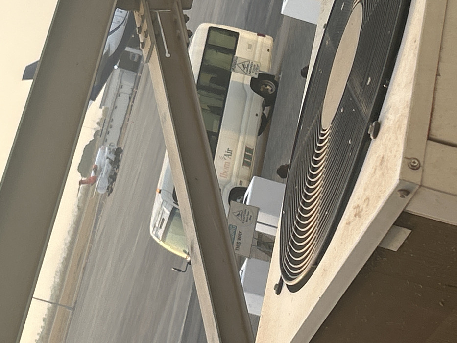 The scene takes place on an airport tarmac in the city of Unknown, Nigeria. The image is captured from an elevated perspective, looking down and across the apron, with structural elements partially framing the view. In the lower foreground, a light-colored industrial unit, likely an HVAC compressor, displays a dark circular fan grill on its top surface. A robust, light-gray metal beam with visible bolts runs horizontally across the mid-upper portion of the frame. On the tarmac, a white passenger bus branded "Ibom Air" in dark letters is parked. It features dark-tinted windows and warning decals on its rear. A white sign reading "THIS WAY" and incorporating a "CAUTION Mind Your Step" pictogram is visible between the foreground unit and the bus, flanked by two white concrete barriers. In the background, a large dark-colored aircraft's tail and a portion of its wing are partially visible on the right. Further to the left, a smaller white aircraft with red tail and wingtip markings is attended by a white tanker truck, suggesting ground service. Low-rise airport utility buildings are discernible in the far background against a hazy, light-gray sky. No clear human figures are distinctly visible.