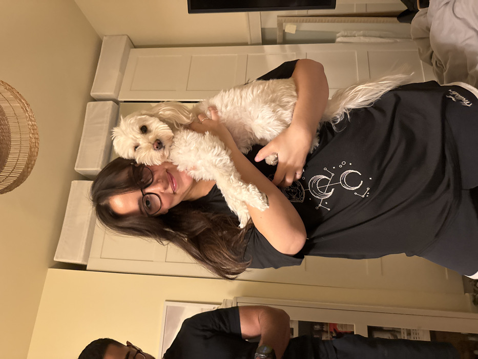 The image depicts an indoor scene in Ramat HaSharon, Israel, featuring two individuals and a dog. A female subject, centered and in the foreground, is smiling directly at the viewer while holding a small, white, fluffy dog. She has long, dark hair, wears dark-rimmed glasses, a black t-shirt with a white celestial-themed graphic, black athletic shorts with a white trim, and a ring on her left ring finger. The dog, a Maltese-type breed, is looking towards the camera. To the left, partially visible, a male subject with dark hair and glasses is seen from the chest up, wearing a black t-shirt and dark shorts, and appears to be looking down at an object in his hands, which include a watch on his left wrist. The background features light-colored walls. Behind the female subject, a large white wardrobe or cabinet with two doors extends from the floor, topped by two rectangular white storage boxes. A circular, woven light fixture hangs from the ceiling. To the far left, a white framed object is visible, and further left, a white shelving unit or cabinet can be seen. To the far right, a dark television screen is partially visible, along with a bed covered in gray bedding. The lighting within the room is warm and artificial.