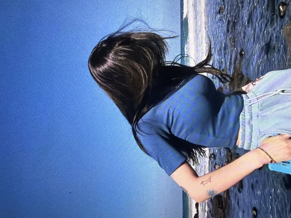 A woman with long, dark hair stands at the edge of a rocky beach. She wears a short-sleeved, blue shirt and light blue pants. Her arm, visible on the right, features a small tattoo. The sky is a clear, vibrant blue, taking up much of the left side of the image. The ocean water is slightly blurred, creating a sense of movement.