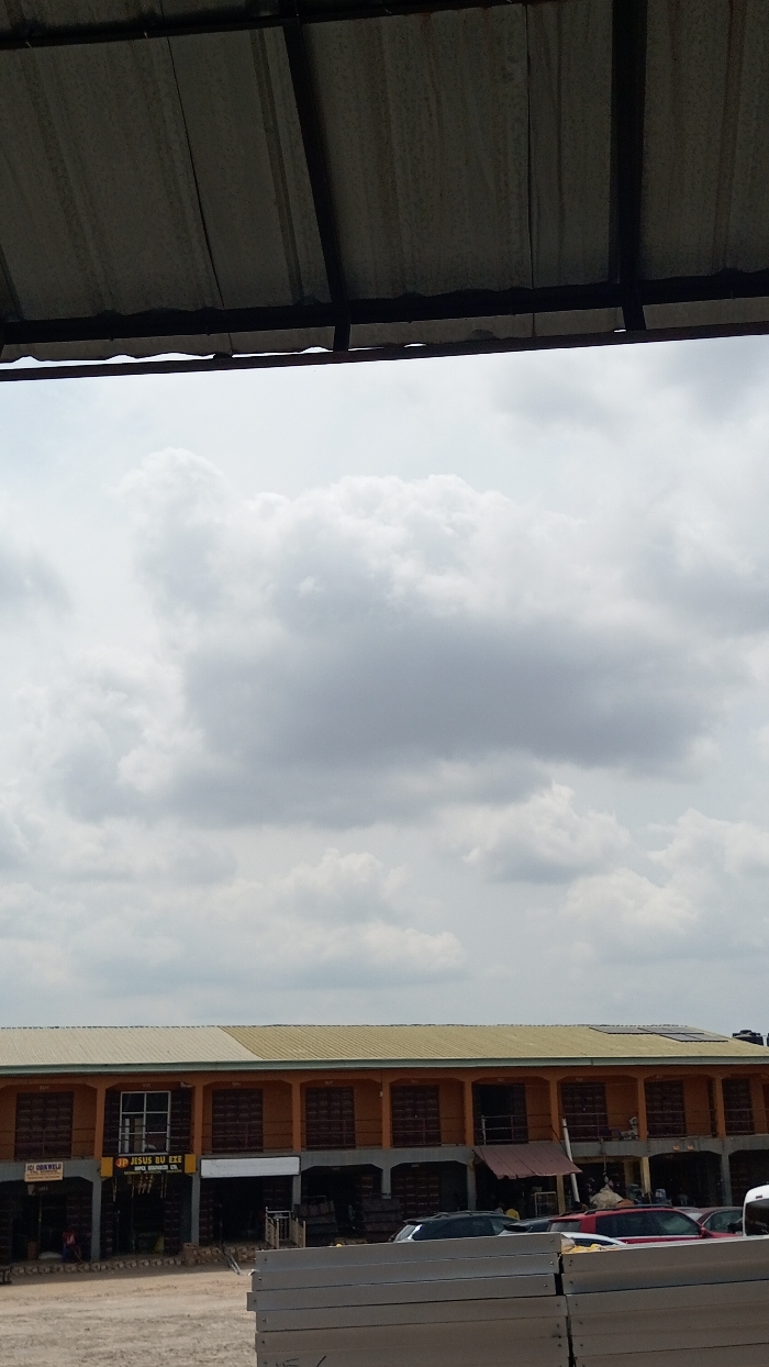 - "The image presents an outdoor scene in Nkpor, Nigeria, framed from below by a dark, corrugated metal roof structure with visible support beams spanning the top approximately 15% of the frame" by FM-zG9EL2, licensed under CC BY 4.0