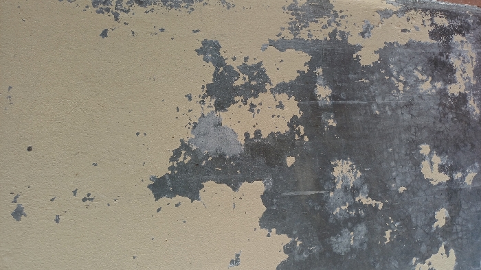 A close-up shot reveals a textured surface, likely a wall or panel, exhibiting significant paint degradation. The left side features a beige-colored layer, mostly intact with minor peeling. Towards the right, this layer is heavily chipped and worn, exposing a darker, grey substrate beneath. The exposed area has a mottled, rough appearance, suggesting underlying material like concrete or plaster. The overall impression is one of age, weathering, and neglect.
