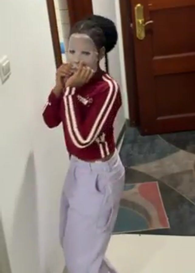 A young woman with her hair in a braided bun is standing in a hallway, applying a white sheet mask to her face. She is wearing a maroon long-sleeved shirt with white stripes on the sleeves, light purple pants, and black and white striped slides. She looks at the camera, then turns her back to the camera while applying the mask. She then turns back to the camera and continues to adjust the mask. The hallway has white walls and a dark patterned tile floor. A dark wooden door is visible to the right of the woman. There is a light switch on the wall to her left, and a small rug on the floor in front of the door.