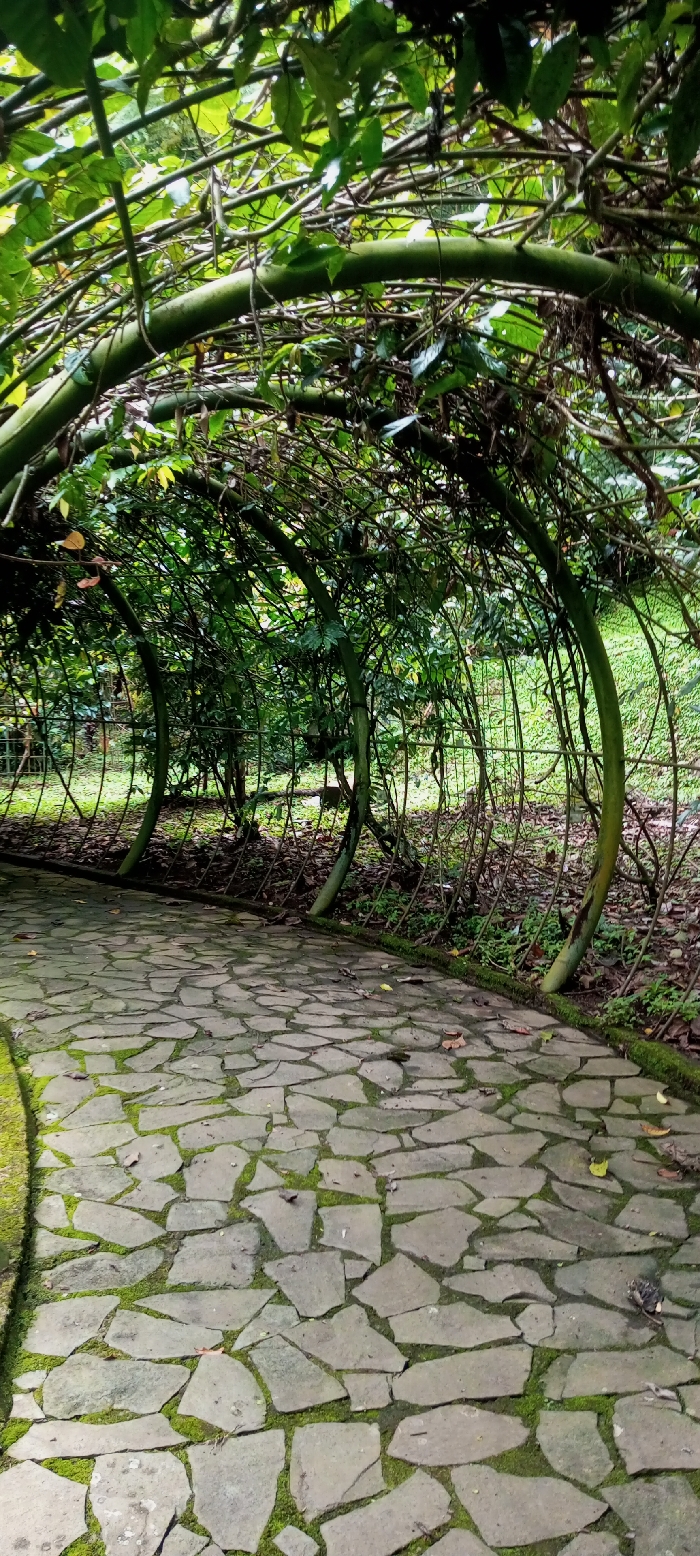 The scene depicts a stone pathway traversing a verdant, tunnel-like structure in Cimacan, Indonesia