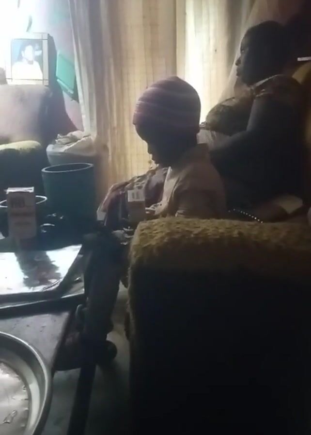 interior of a living room. Two people are visible: one wearing a striped hat, seated and holding a small box, and another seated on a couch behind. The room contains upholstered furniture, a small table with items on it, a blue trash can, and a television on a stand. There are curtains on the window and framed pictures on the walls. The lighting is dim. The camera pans to show more of the room.