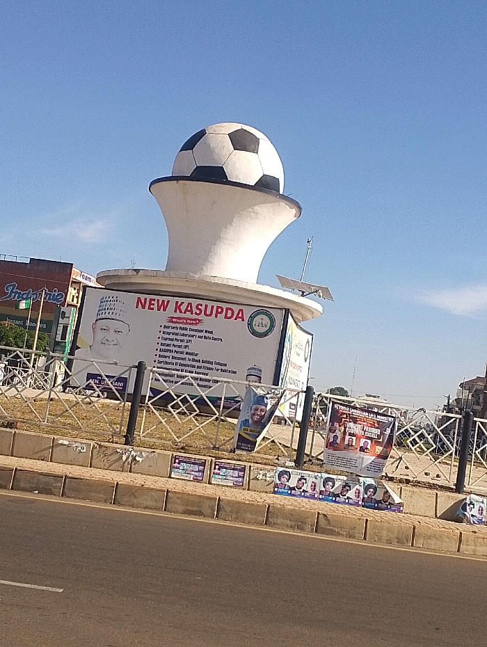 This image captures a prominent football-themed monument situated in a city environment identified as Dadi Riba, Nigeria, under a clear blue sky. The central subject is a large monument featuring a white, flared pedestal structure, upon which rests an oversized, black-and-white soccer ball. Around the base of this monument, large informational billboards are displayed. One prominent billboard, labeled "NEW KASUPDA," features the smiling portrait of a man, likely a political figure, and lists various services or initiatives such as "Quarterly Public Complaint Week" and "Integrated Laboratory and Data Centre." A small solar panel is visible on the upper rim of the monument, possibly for power generation. The monument is located within what appears to be a central reservation or roundabout, bordered by a paved road in the foreground. A low concrete curb and a metal fence with a diamond-patterned design separate the road from the monument's immediate base. Numerous posters and banners are affixed to this fence and placed along the curb. These include political campaign materials displaying portraits of individuals and slogans like "GOD DEA DEA," alongside advertisements for religious events such as "REVIVAL EMPORIUM LIFE MINISTRY" with the text "POWER TO EXCELL." In the background, to the left, commercial buildings are visible. One building displays the "Indomie" brand, while another appears to be associated with "foam." The sky is devoid of clouds, indicating clear weather. No individuals or active interactions are discernible within the frame.