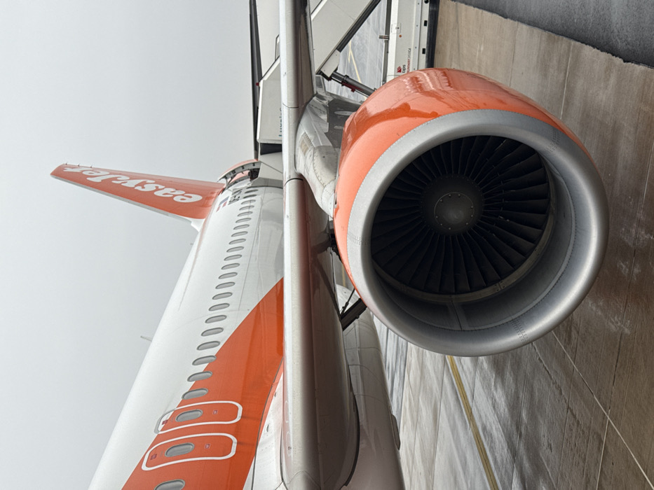 - "An eye-level, close-up shot displays the rear section of an EasyJet airplane, rotated 90 degrees clockwise" by FM-euyLP2, licensed under CC BY 4.0