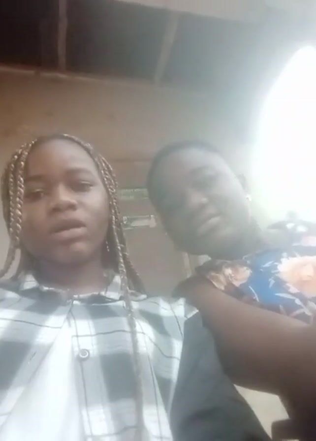 Two young women are posing close together for a selfie. The woman on the left has light brown braids and wears a white t-shirt under a plaid shirt. The woman on the right wears a floral-print dress. They are under an overhang or porch, with a door visible behind them. The lighting is bright and slightly overexposed.