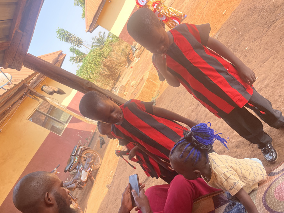 The scene depicts an outdoor residential setting in Oturkpo, Nigeria, under bright daylight. A dark-skinned adult male with a shaved head and beard, wearing a dark top and red pants, is seated on the left, engrossed with a dark-colored smartphone held in both hands. Four children are present: three young boys wearing matching red and black striped short-sleeved shirts and black trousers are positioned in the center and right foreground. The central boy looks down, holding a small red object. The boy on the far right also looks down, adjusting his collar with his right hand. A third boy in a similar uniform is partially visible behind the central child. To the bottom left, a younger child with dark skin and prominent blue braided hair sits on a colorful woven mat, wearing a light yellow patterned shirt and light shorts, looking down and left. The ground is dry, reddish-brown earth. In the background, a two-tone building with orange and yellow walls and a visible window is present. A black and dark green Yamaha motorcycle is parked behind the adult male. A white satellite dish is visible on a rooftop. Further back, dry vegetation and another building with a light-colored roof are visible. A black chicken is foraging near the parked motorcycle. Wooden support beams for an overhead structure are prominent in the midground, casting shadows. Colorful decorative items are strung on a structure in the far right background.