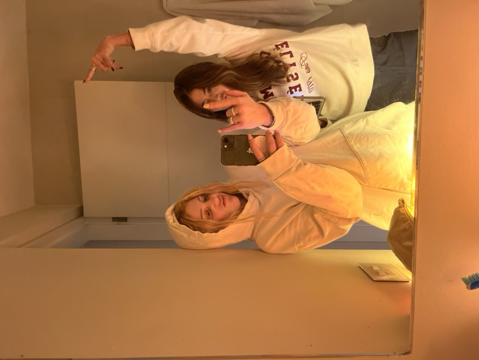 Two young women are reflected in a mirror. The top woman has long brown hair and wears a white sweatshirt with red text. She's pointing with one hand and making a hand gesture with the other while holding a phone. The bottom woman has long blonde hair and is wearing a white hoodie, her face visible. The mirror shows a white bathroom surface below and a white wall behind them. The lighting is warm, giving the image a yellow tint.
