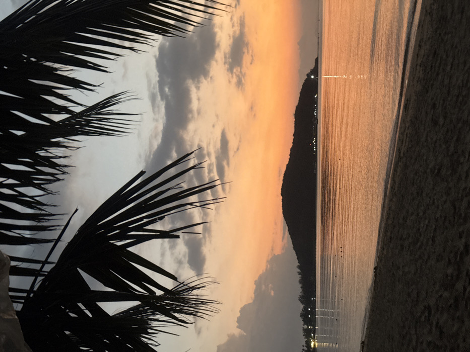 The image depicts an outdoor coastal scene at either sunrise or sunset, with the sky transitioning from light gray at the top to vibrant orange and yellow hues near the horizon. Overcast conditions are present, with multiple dark gray cloud formations visible across the upper and middle sky. In the foreground, the dark silhouettes of several palm fronds frame the top portion of the image. The midground is dominated by a calm body of water, reflecting the orange light from the sky. A dark, hilly landmass or island occupies the distant horizon on the right, presenting as a silhouette with several distinct points of artificial light visible at its base, which reflect vertically on the water's surface. To the far left, a distant shoreline is visible, illuminated by additional artificial lights, also reflecting on the water. Multiple small, dark, indistinct objects, possibly buoys, are present in the mid-left portion of the water. The immediate foreground consists of a strip of dark, wet sand, indicating a beach, where the water gently meets the shore. No individuals are visible. The scene is located in the city of Tong Yang, Thailand.