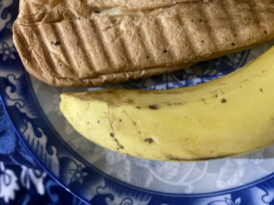 - "A banana rests on a blue and white patterned plate, positioned next to a tan, panini-pressed sandwich" by FM-KX5IH3, licensed under CC BY 4.0