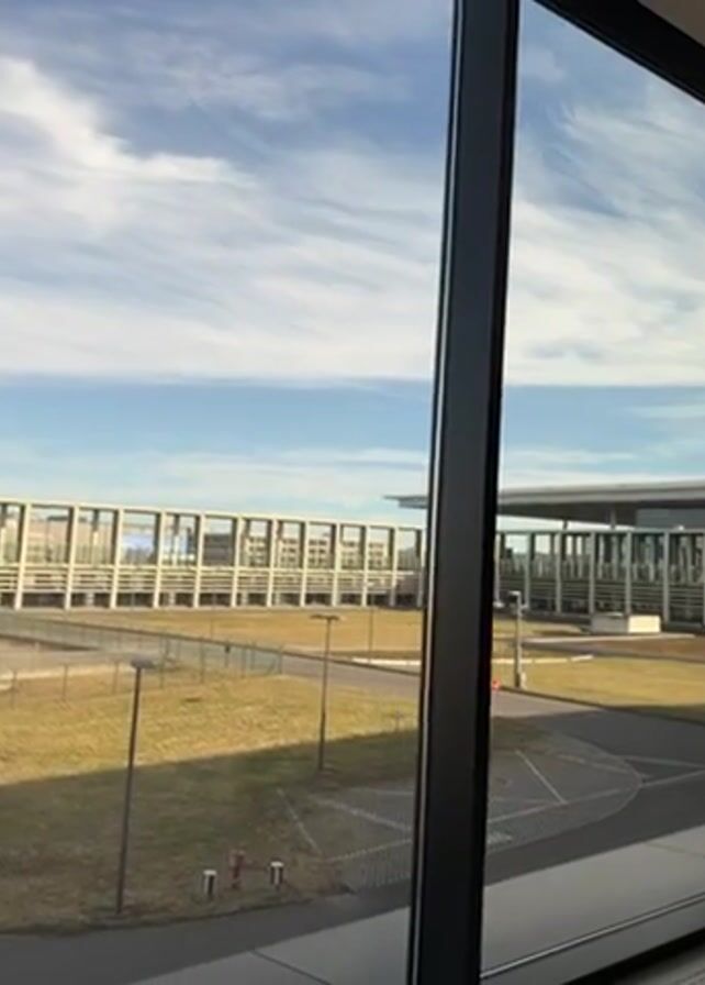 view from inside a building, looking out through a large window. The window frame is black. Outside, there's a large, modern building with a grid-like facade. There's a grassy area and a paved area with parking spaces in front of the building. Several lamp posts are spaced throughout the scene. The sky is blue with wispy white clouds. The overall impression is of a clean, organized, and modern environment.