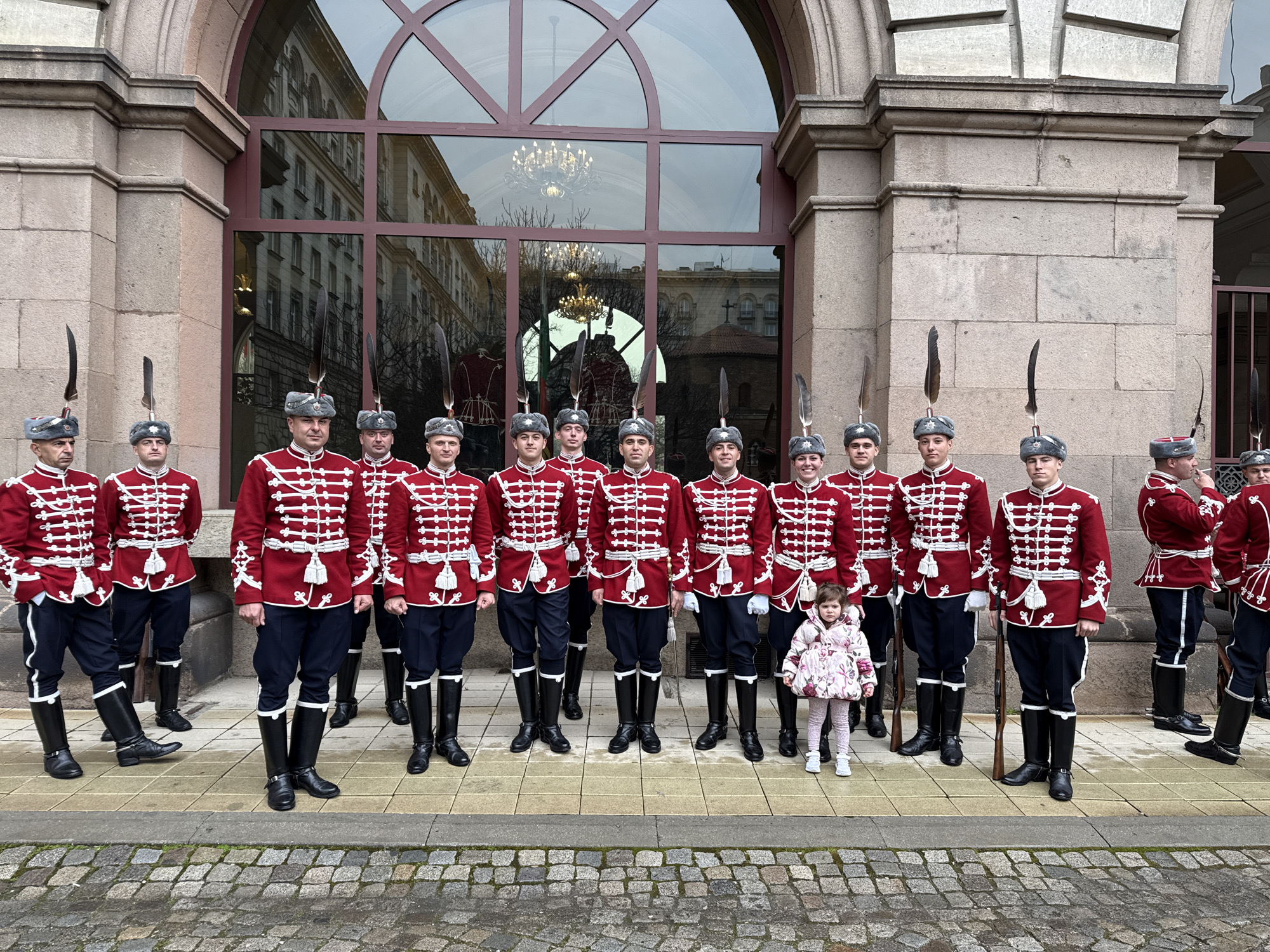 A full, eye-level shot shows a group of twelve guards in traditional red and white uniforms standing in formation outside a building. Each guard wears a dark, fuzzy hat with a feather and black boots. A young girl in a pink floral jacket and light pants stands in front of them. The building behind them has large, arched windows that reflect the surrounding cityscape and a chandelier. The ground is paved with cobblestones. The location is likely in the city of Sofia, Bulgaria, given the attire of the guards, suggesting that this is the Presidential Palace where ceremonial guards are stationed.