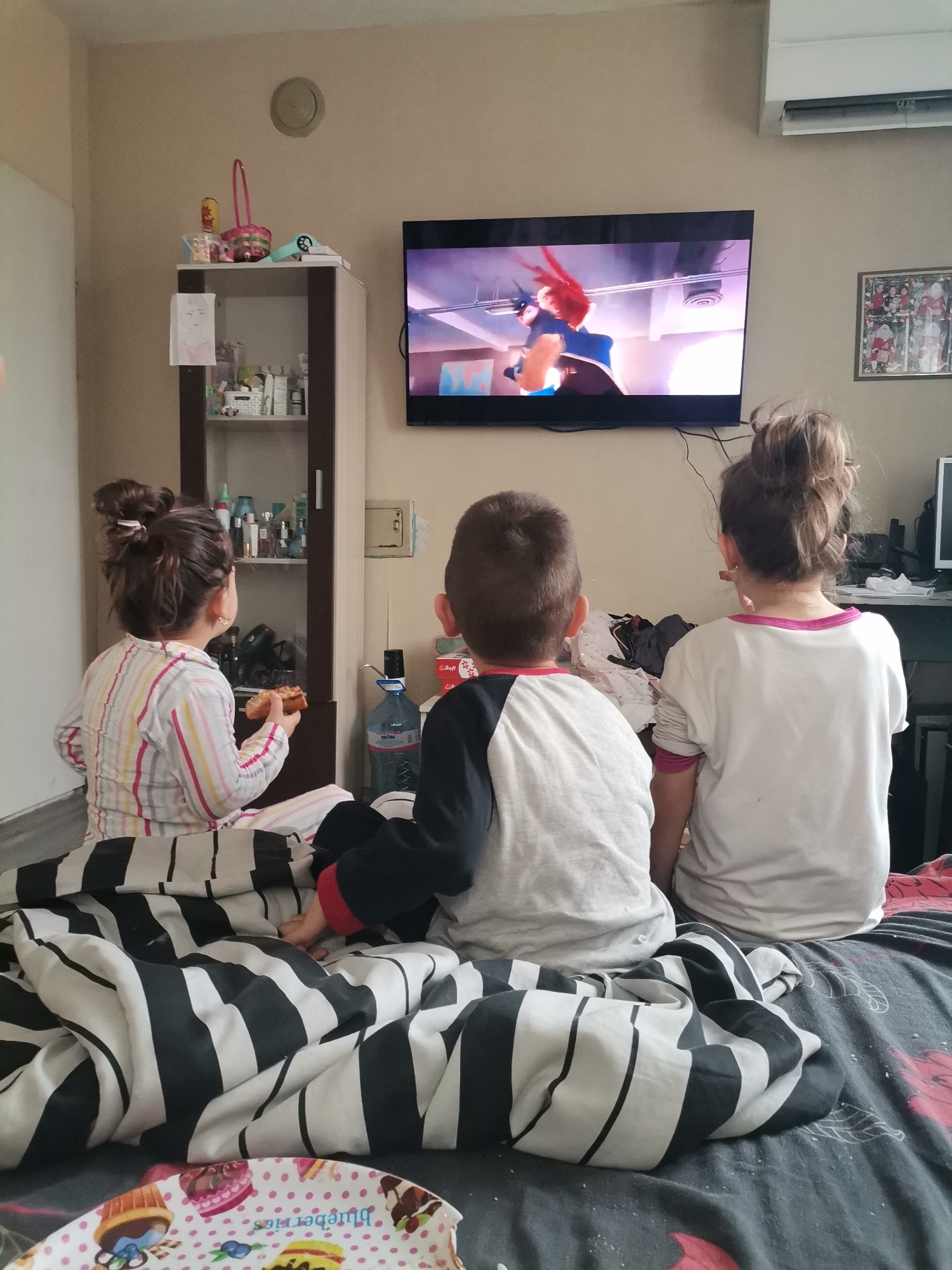 This image captures an indoor scene in Obrochishte, Bulgaria, depicting three children seated on a bed, facing away from the viewer, intently watching a flat-screen television. From left to right, the first child wears striped pajamas (white, pink, and yellow lines) with hair tied in a high bun, holding a piece of light-colored food, possibly pastry. The second child wears a two-toned long-sleeve shirt (light grey body, dark sleeves) and has short, dark hair. The third child wears a white t-shirt with a pink trim at the collar, also with hair tied in a high bun. The children are seated on a bed covered with a dark grey fitted sheet featuring red patterns. A crumpled black and white striped duvet or blanket is positioned in front of them on the bed. A decorative paper plate with cupcake illustrations rests on the bed in the foreground. The wall directly in front of the children is light-colored. A black flat-screen television is mounted centrally on this wall, displaying an animated scene featuring a character with red hair. To the left of the TV is a tall, narrow cabinet with dark and light wood sections, containing various bottles and containers, likely toiletries. A light-colored drawing is taped to the cabinet's side. On top of the cabinet, a small pink basket and other miscellaneous items are visible. Above the cabinet, a circular wall vent is present. To the right of the television, a white wall-mounted air conditioning unit is visible. Below it, a framed picture depicting multiple individuals, including a person dressed as Santa Claus, hangs on the wall. Behind the children, on a surface to the right, a large transparent plastic water bottle (Devin brand) and a red can are present. An electrical outlet is also visible on the wall behind the children.