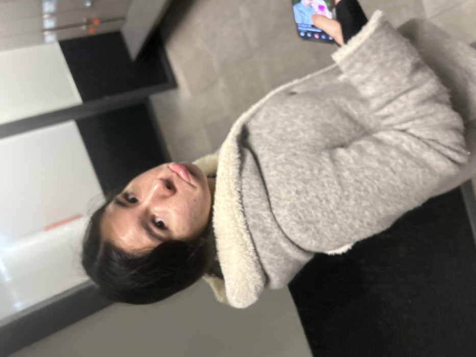 A female individual, centered and partially turned towards the camera, exhibits a pouting facial expression. She has dark hair and wears a light grey coat with a cream-colored sherpa lining visible at the collar and cuffs. In her right hand, she holds a smartphone displaying a colorful image, with her index finger positioned on the screen. The background depicts an indoor public environment, characterized by walls segmented into an upper white section and a lower black section. A distinct red vertical stripe is visible on the upper left wall, adjacent to a structural column or doorway. To the right, a dark, narrow bench or platform recedes into the background. The floor is light grey and appears tiled. This setting is consistent with the architecture and design commonly found within the Madrid Metro system in Madrid, Spain.