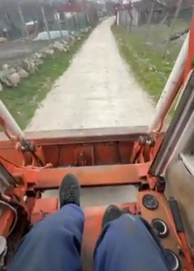 The view from inside a tractor shows the driver wearing blue pants and black sneakers