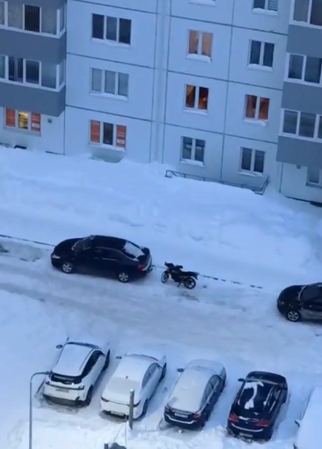 snow-covered residential area from an elevated perspective. A multi-story apartment building stands in the background, with windows showing some interior lights. In the foreground, a parking lot is covered in snow. Several cars are parked, mostly white and dark in color, with some snow accumulation on their surfaces. A small motorcycle is parked adjacent to a dark car. A children's playground with slides and other equipment is also visible, partially covered in snow. The sky is overcast, suggesting either dawn or dusk. No people are distinctly visible in the scene.