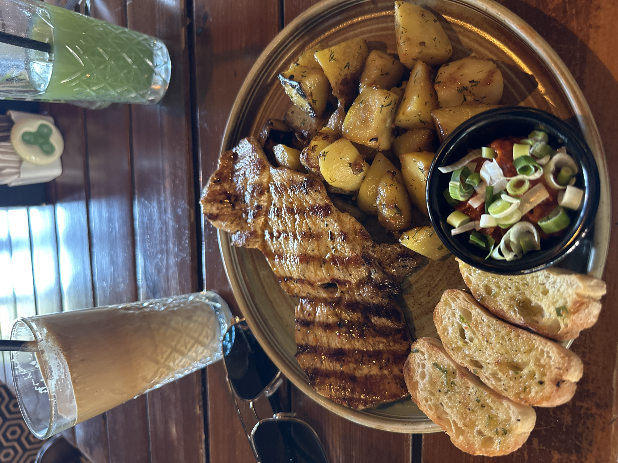 A top-down shot shows a meal on a wooden table. The meal consists of a grilled steak, roasted potatoes with herbs, three slices of garlic bread, and a small bowl of diced red peppers and green onions. A glass of light green liquid is visible in the upper left corner, and a glass of beige liquid and sunglasses are in the lower left corner. A white condiment packet sits next to the green drink. The setting might be a restaurant in Pernik, Bulgaria.