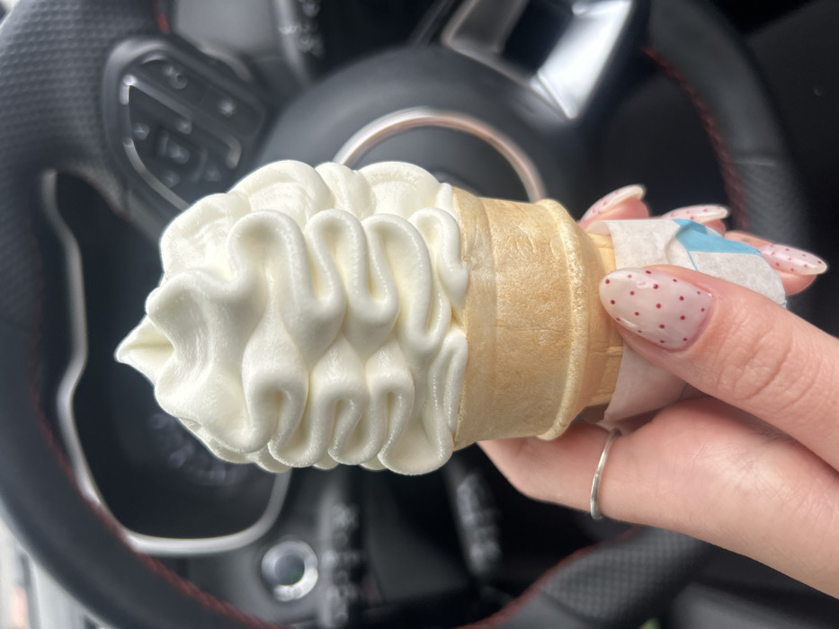 A hand holds a soft-serve ice cream cone in front of a car steering wheel