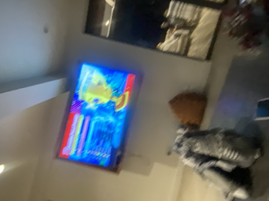 A tilted view shows a room with a framed picture displaying a vibrant blue design with hints of yellow. Above it, a dark-framed mirror reflects light. To the side, a small brown doll rests near a stack of clothes, possibly a blanket or pile of laundry. A small tablet is near it. The scene appears somewhat cluttered and brightly lit from the screen's glow.