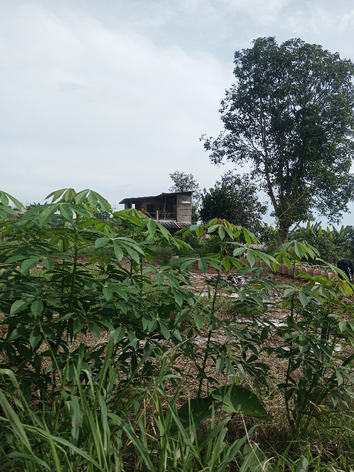 This image depicts a rural landscape in Kandenuwara, Sri Lanka, under an overcast sky. In the foreground, dense green foliage, primarily consisting of cassava plants with distinct palmate leaves, and blades of grass fill the lower portion of the frame. A single large, dark green taro or similar broad-leafed plant is visible at the bottom center. In the midground, a two-story, rustic structure constructed from wood or composite materials with an unpainted finish and a sloped roof is positioned slightly left of center. The lower level features a small open balcony. A single individual, dressed in an orange garment, is standing on this balcony, facing generally rightwards. To the right of the structure, an organized stack of light-colored, rectangular blocks (possibly concrete) is visible on the ground. Further to the right, a second individual, wearing dark clothing, is partially obscured and appears bent over, engaged in an activity near a cluster of broad-leafed plants, consistent with banana trees. The background is dominated by a tall, mature tree with a dense canopy of dark green leaves on the far right. Additional green trees and vegetation are scattered across the horizon. The sky is a uniform light grey, indicative of overcast conditions.