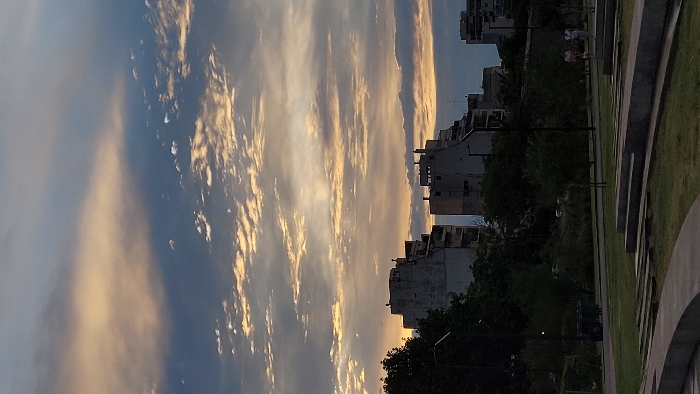 A landscape-oriented image depicts a sunset sky with layered clouds in shades of blue, gray, and yellow. Silhouettes of apartment buildings are visible along the horizon, interspersed with trees. A park area with tiered concrete steps and manicured grass extends into the foreground. The photograph is taken from a low angle, emphasizing the sky and the urban park setting.