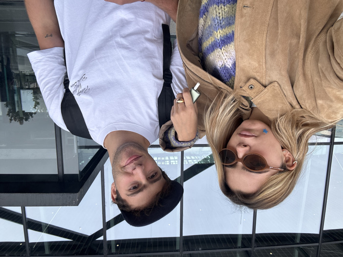 A medium shot depicts two individuals, a female and a male, standing outdoors in front of a modern building with extensive glass windows and dark framing, located in Colombier-Saugnieu, France. The female on the left has shoulder-length blonde hair, wears small oval brown sunglasses, and has a blue star-shaped patch on her left cheek. She is dressed in a tan suede jacket over a blue and cream striped knitted sweater. Her right hand, adorned with two gold rings, holds a small, light-colored electronic device. Her left arm rests on the male's right shoulder. The male on the right has brown hair and wears a dark corduroy baseball cap. He is smiling faintly and wears a white t-shirt with a dark logo on the chest and a black backpack. A small tattoo reading "Ginga" is visible on his left forearm. Both individuals face the camera. The sky is overcast, reflected in the background windows.
