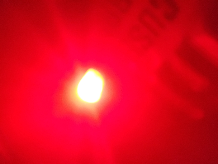 A blurry, close-up image shows a predominantly red background. A bright, undefined light source is centrally located, appearing as a glowing white-yellowish blob. A hint of darker, undefined shapes is visible in the upper right area, potentially indicating objects out of focus. The overall image lacks sharp detail and clarity due to the blur.