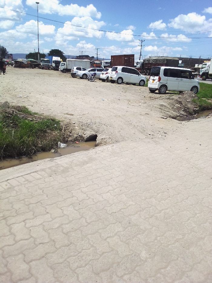 The image depicts an outdoor urban environment in Nakuru, Kenya, under a blue sky with scattered white clouds. The foreground consists of a light-colored paved surface, constructed from interlocking concrete blocks in a wave pattern, bordering a dirt embankment covered with green vegetation. At the base of this embankment, a narrow ditch contains muddy water and visible debris, including a white plastic bag, with a small culvert opening leading into it. The midground features an unpaved dirt expanse occupied by a row of parked or stationary vehicles. These include multiple white passenger cars (compact vans and sedans), a silver car, and a white motorcycle positioned between two cars. On the far left, at least two individuals are walking away from the viewer. In the background, numerous larger vehicles, such as trucks and a brown shipping container on a trailer, are present, along with utility poles, overhead power lines, and a tall street light. Distant buildings and trees are visible on the horizon.