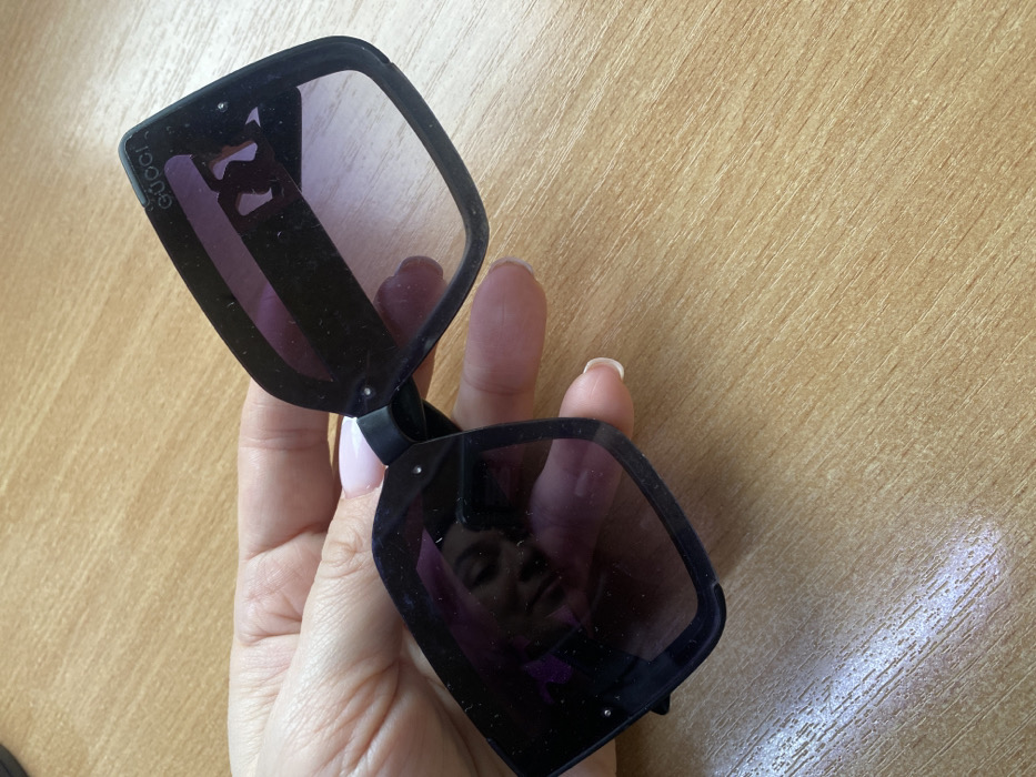 A human hand with manicured nails (light pink polish) holds a pair of black-framed sunglasses, identified by the "GUCCI" branding on the upper right lens. A faint reflection of a human face is visible in the left lens of the sunglasses. The object and hand are positioned over a light brown wooden surface with visible grain patterns. The scene takes place in the city of Ol'khovskoye, Russia.