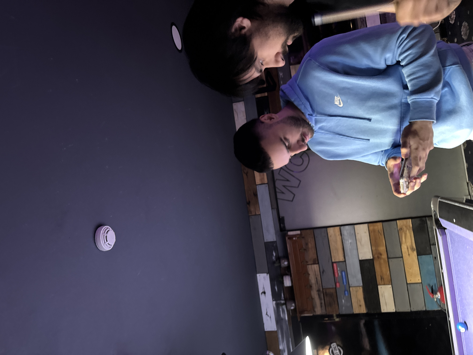 A man wearing a blue Nike hoodie stands next to a purple pool table, holding a cell phone in his hands. Behind him is a wall made of various colored wooden planks. A fire extinguisher can be seen near the corner of the pool table. Reflected in the upper left corner of the image is a person, possibly the same man, holding a pool cue. On the left wall is a round smoke detector. The background suggests an indoor recreational area. There are no clear indicators of the city of Plovdiv, Bulgaria, in the image.