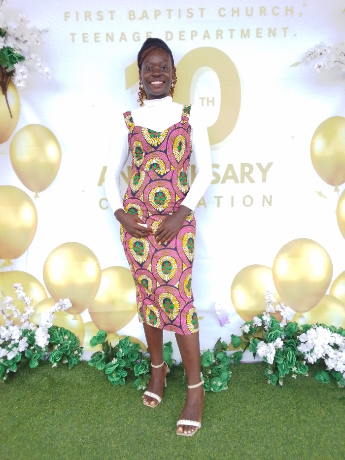 young woman standing in front of a white backdrop with a celebratory message. She is wearing a white long-sleeved shirt and a pink and green patterned skirt. The background is decorated with large gold balloons, artificial plants, and a white sign reading "First Baptist Church, Teenage Department". The woman is smiling and looking at the camera. The coordinates 4.932, 6.268 place the location in the city of Yenagoa, Nigeria. The setting appears to be a church or community event space. The image captures a moment of celebration.