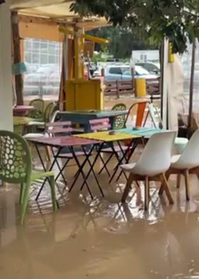 The scene shows an outdoor cafe area partially submerged in muddy water. Tables and chairs, painted in bright colors, stand in the water. Some tables are closer to the building, which offers some shelter under its awning. The water is still rippling, suggesting ongoing rainfall or recent flooding. In the background, beyond the partially covered cafe, there are parked cars and a trailer. A tree is visible, providing additional shade.