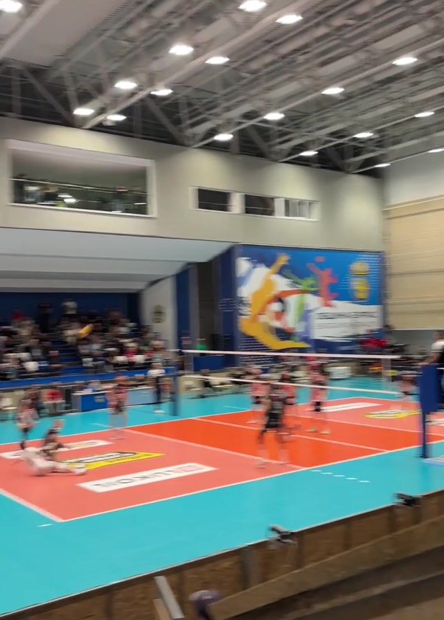 A volleyball game is taking place in a large indoor arena with a high ceiling and overhead lighting