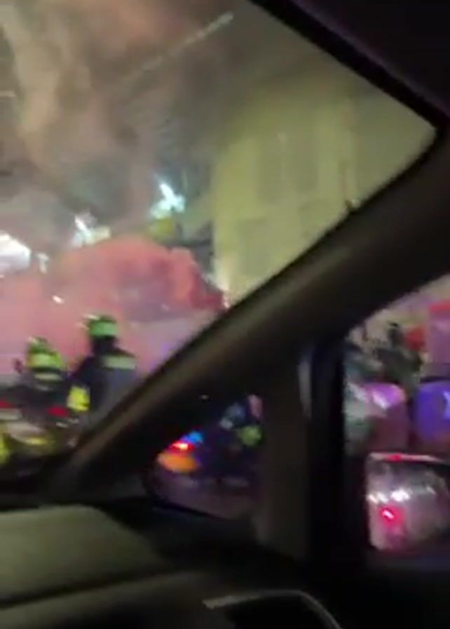From inside a car, the video shows a scene with police motorcyclists moving through a crowd amid red smoke