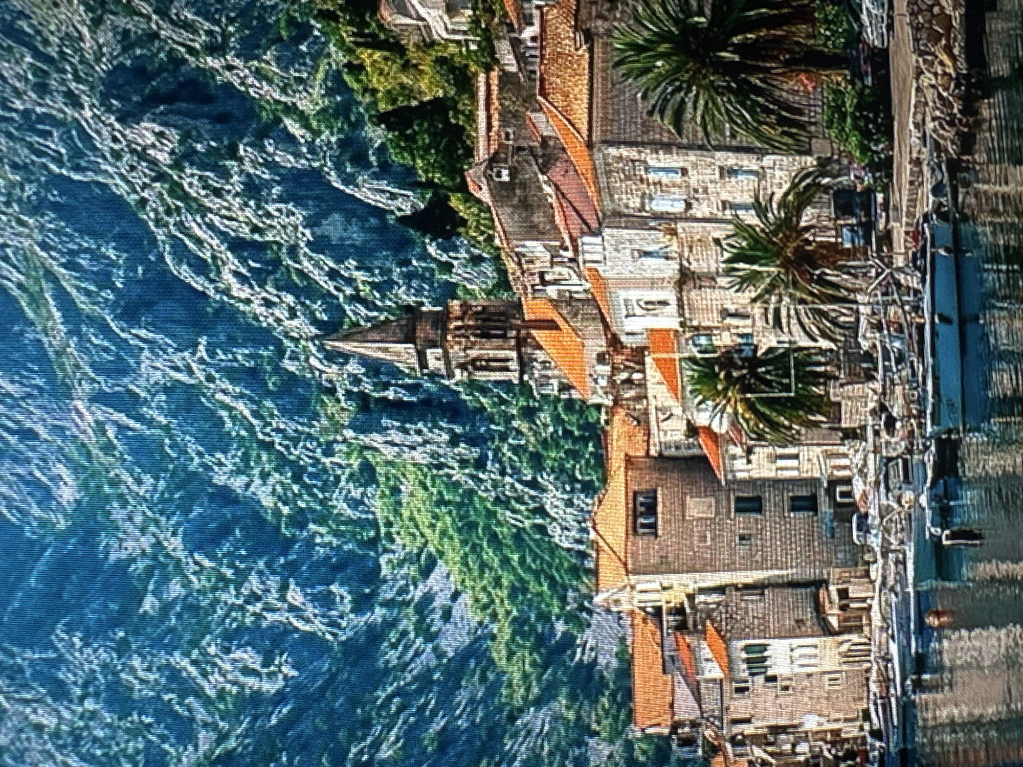 The image displays a coastal town nestled at the base of imposing, craggy mountains. The mountains, covered in sparse green vegetation and exposed rock, form a dramatic backdrop. The town comprises numerous multi-story buildings constructed from light-colored stone or stucco, each featuring distinct orange-red tiled roofs. A tall, multi-tiered bell tower with a pointed spire is a prominent architectural feature, rising centrally above the other structures. Several large palm trees are visible along the waterfront and within the town, interspersed with other green foliage. In the foreground, a body of water, likely a bay or inlet, contains numerous moored recreational boats of various sizes, including motorboats and sailboats. A stone or paved quay borders the water, behind which a narrow road is visible with a few parked vehicles. No individuals are discernibly present in the scene. This location is not in Budapest, Hungary. The scene's geography, characterized by towering coastal mountains, a bay with boats, and palm trees, is inconsistent with Budapest's landlocked position on the Danube River and its urban landscape. The visual evidence suggests a Mediterranean or Adriatic coastal setting.
