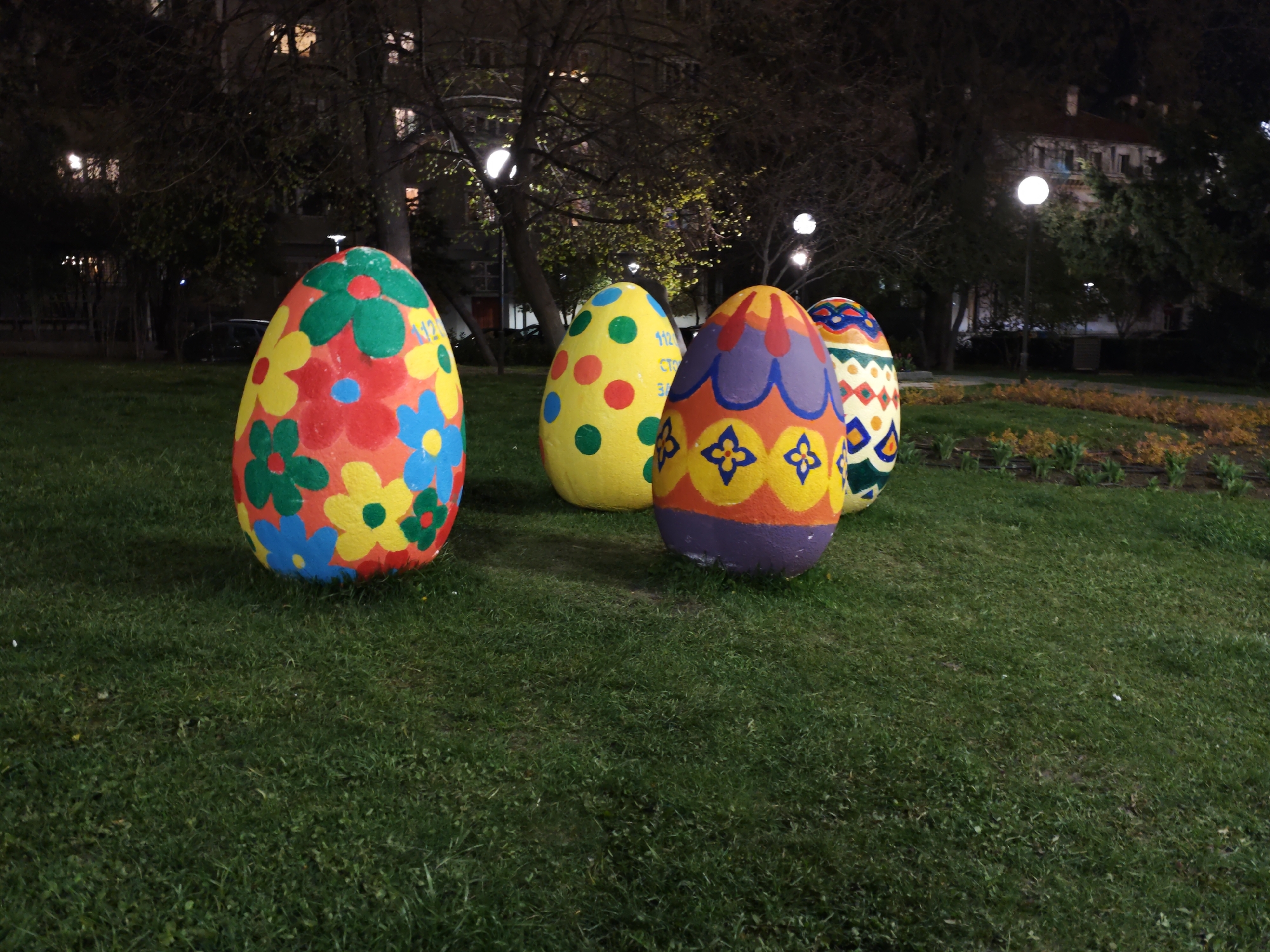 - "four large, decorated Easter eggs on a grassy lawn at night" by FM-xCddJ3, licensed under CC BY 4.0