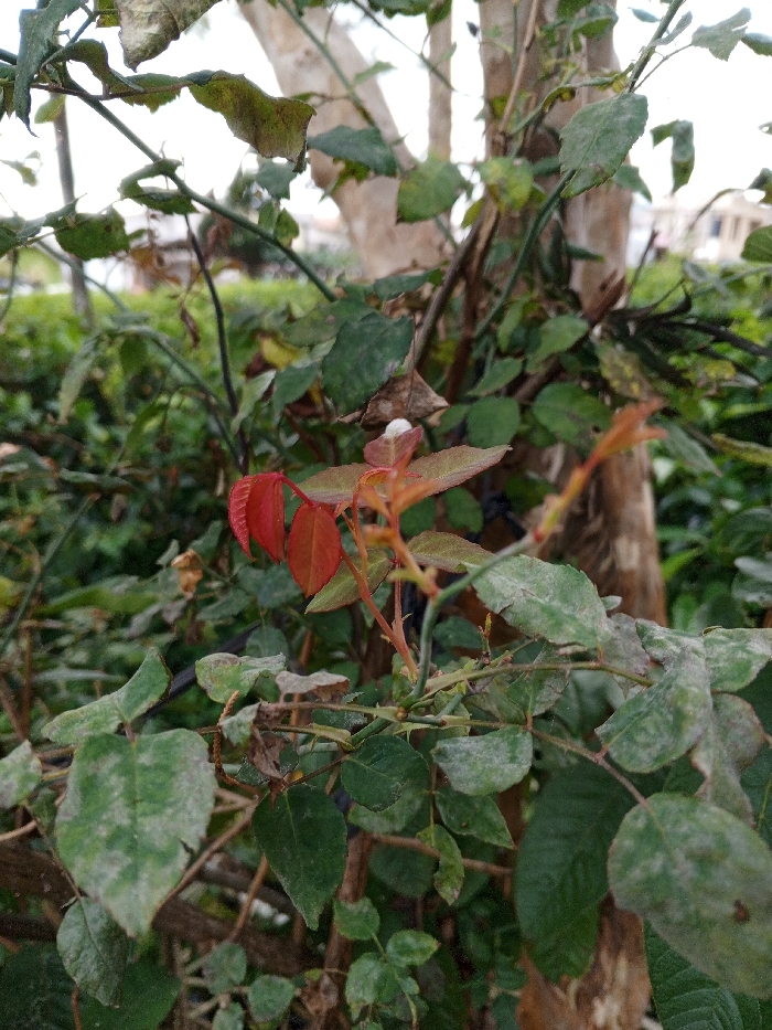 The image captures a close-up, static scene of plant foliage located in the city of Catarman, Philippines. The primary subject is a section of a plant, consistent with a rose bush, featuring numerous green leaves, many of which are covered with a noticeable white or pale grey powdery residue. Central to the composition is a vibrant cluster of new growth, exhibiting bright red and orange young leaves on slender, thorny stems. A small, white, spherical bud is visible at the tip of one of these new shoots. The background is out of focus, showing additional green vegetation, a light-colored tree trunk, and indistinct structural forms under an overcast sky. No individuals are present in the frame, and no discernible actions or interactions are occurring.