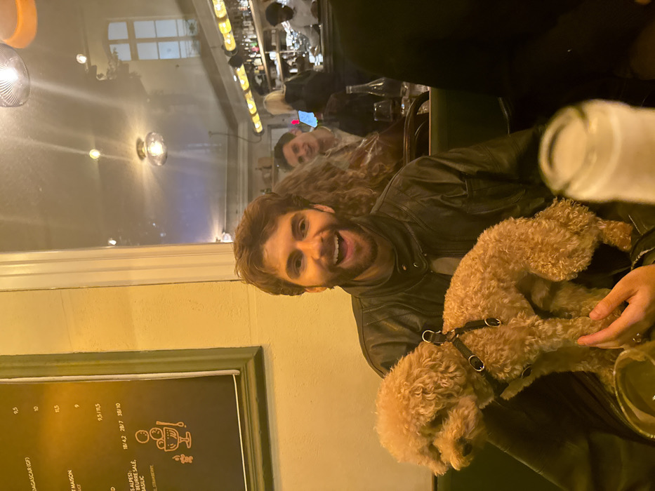 An indoor restaurant scene in the city of Unknown, Unknown, features a man with dark curly hair and a beard, wearing a black leather jacket, smiling broadly directly at the camera. He holds a small, light brown, curly-haired dog fitted with a black harness on his lap. Hands with painted fingernails and a ring support the dog from below. To the left, a dark menu board with white text, displaying French words such as 'MADAGASCAR' and 'BASILIC' along with prices, is framed by a green border against a light yellow-green wall. A large window or mirror behind the man reflects a brightly lit bar area with various patrons and staff. Visible in the reflection are a man smiling towards the camera, a blonde woman, and a dark-skinned man tending the bar. Ceiling light fixtures and a multi-paned window are also reflected. A blurred white bottle neck occupies the bottom right foreground.