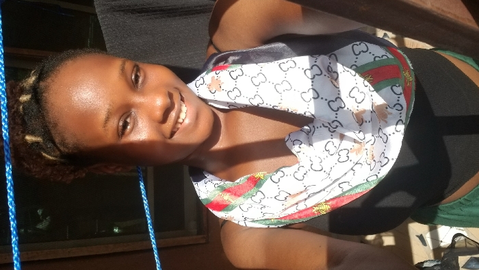 This image depicts a single young adult female, likely of African descent, captured in a close-up portrait in the city of Onitsha, Nigeria. The subject, positioned centrally, is smiling directly at the camera. Her dark-toned skin appears luminous due to direct, strong sunlight, casting a shadow on her neck and chest. Her hair is dark, styled in small braids or twists, some with lighter accents, gathered on top of her head. She wears a black tank top and a white infinity scarf or wrap featuring a repeating pattern of black stylized 'G' shapes and sections with red and green stripes. A glimpse of a dark, possibly black, lower garment is visible, with a small portion of green fabric on the lower left. The background is partially out of focus; a prominent blue, braided rope extends horizontally across the upper frame. Behind her, a dark, reflective surface, possibly a window, is visible, along with a dark vertical structure on the right side of the frame. No other individuals or explicit interactions are present. The lighting suggests an outdoor environment under bright daylight conditions.
