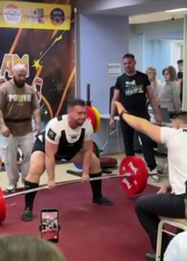 man performing a deadlift in what appears to be a powerlifting competition. He's wearing a black and white singlet and black socks. The barbell has multiple weight plates on it, primarily red. He strains considerably, and with effort successfully lifts the weight. After lifting the barbell, the lifter is given a hand signal by a judge/official who stands near the barbell, signaling a successful lift. Other men are standing nearby, seemingly coaching or spotting. A phone is recording the lift from near the ground. A banner hangs in the background with text in Russian. The environment looks like an indoor gymnasium or sports hall, with various people watching.