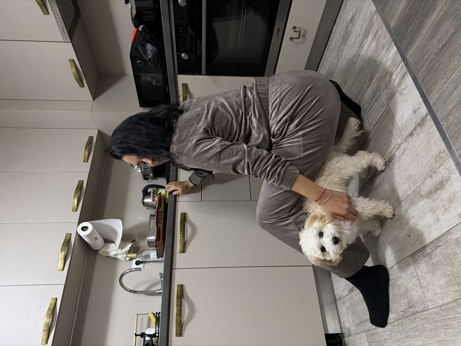 An indoor scene in a modern kitchen, identified as being in Sofia, Bulgaria. A female individual with dark hair, wearing a grey velour sweatsuit and black socks, is crouching on a light grey wood-look floor. She is positioned with her back partially to the viewer, facing towards the kitchen counter and cabinets. Her right hand rests on a brass-colored handle of a lower light-beige cabinet. Her left hand is placed on the back of a small, fluffy, cream-colored dog that stands between her legs, facing the viewer. The kitchen features light-beige upper and lower cabinets with wave-pattern brass handles, a dark grey countertop, and a stainless steel sink with a chrome faucet. A white paper towel roll is mounted under an upper cabinet. Items on the counter include a bottle, a "PIZZA" box, a black kettle, and other small appliances. A black microwave oven is visible on the counter, and a built-in "LING" brand oven is located below the counter on the right side of the image. The woman wears red and silver string bracelets on her left wrist.