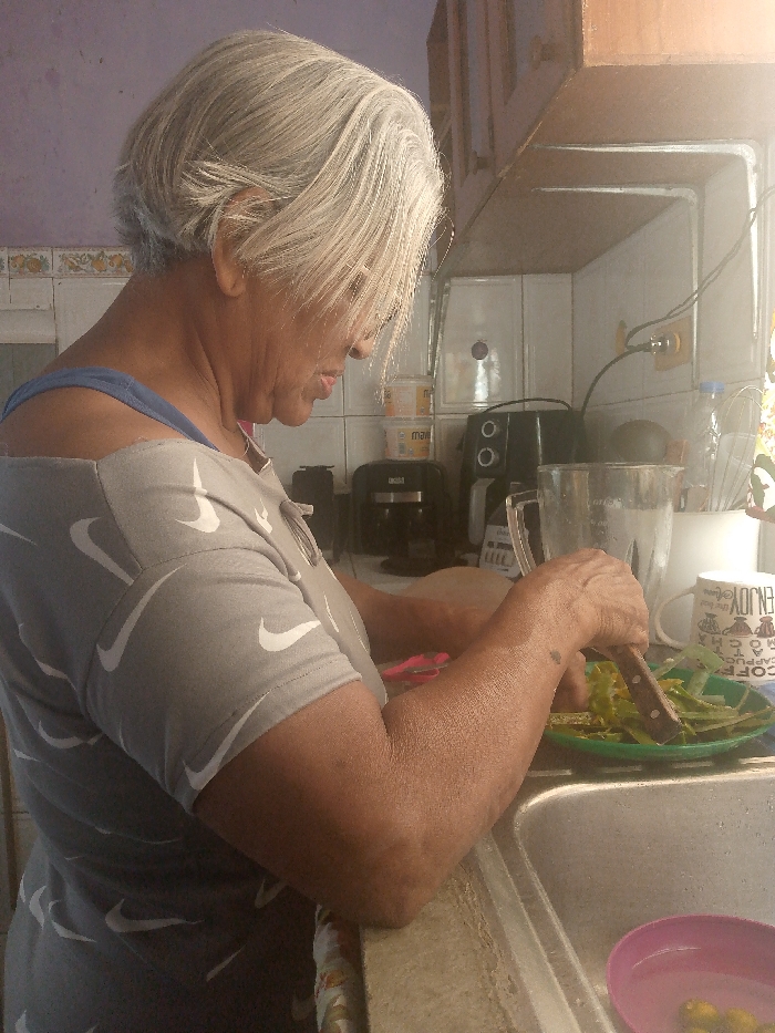 In a kitchen located in Sabana de Machango, Venezuela, a light-skinned adult female with short, styled silver-grey hair is depicted in profile, looking down and to her right