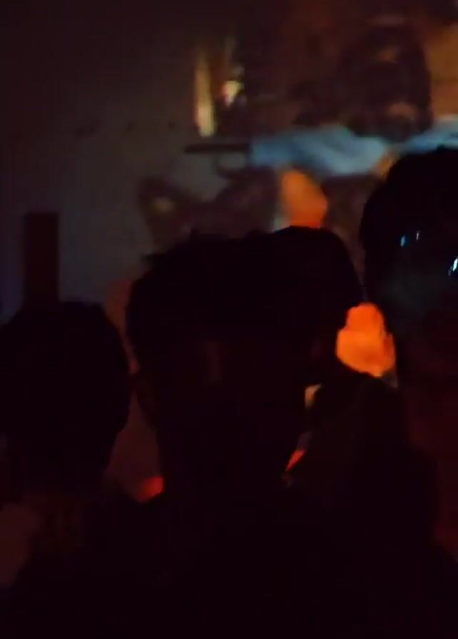 three people in a dark, crowded environment. One of the individuals appears to be male, with curly hair, wearing a black shirt and a necklace. He's seen moving and gesturing with his hands. Another person is also visible, wearing glasses and a dark top. The third person is mostly in silhouette. A projection with the word "Condadismo" and abstract images is visible on the wall behind them. The environment is dimly lit, suggesting an indoor space, possibly a club or party. The music playing in the background is loud and electronic.