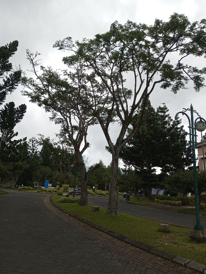 A cloudy day illuminates a park with mature trees flanking a brick road