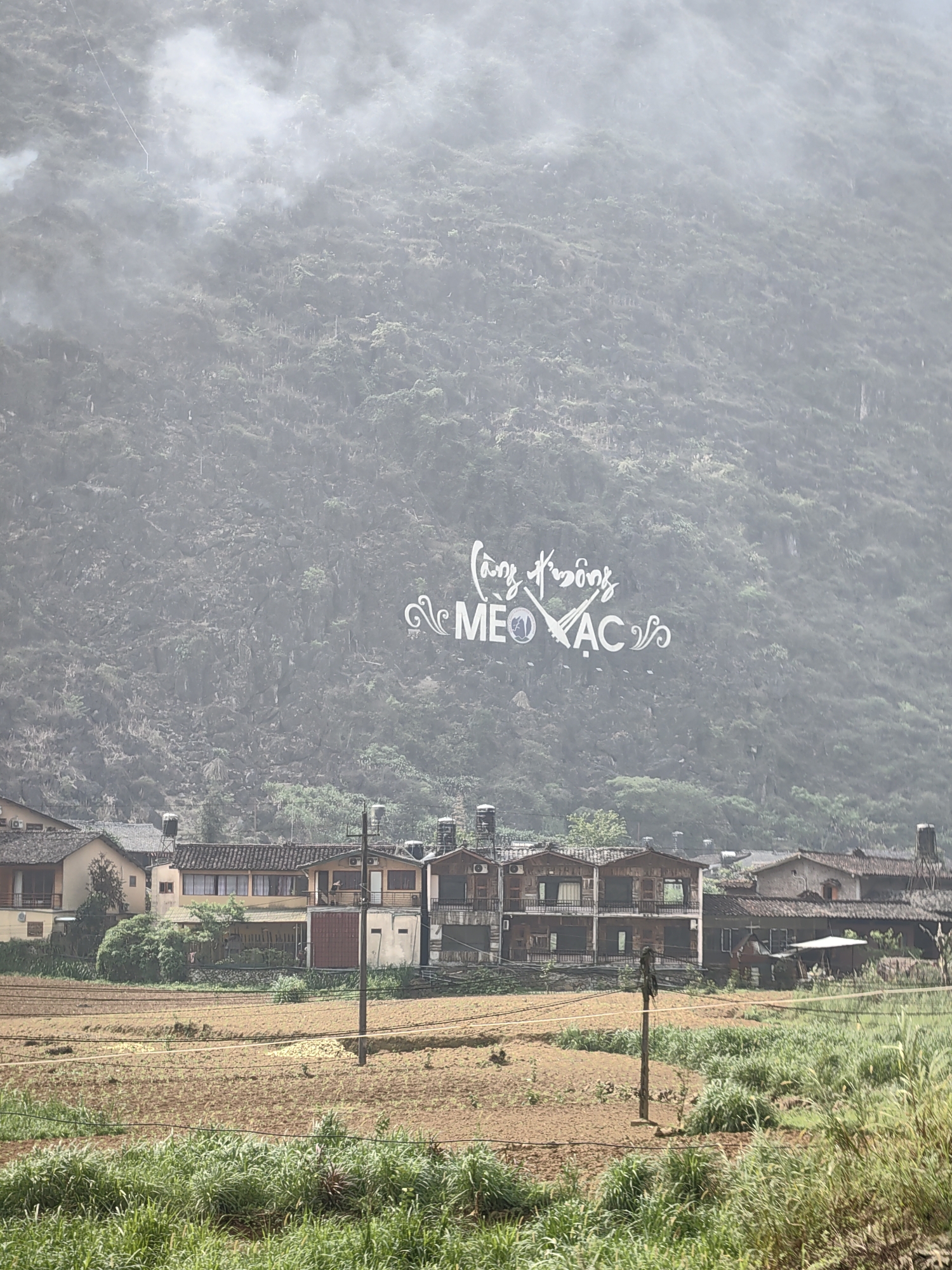 The scene captures the town of Mèo Vạc in Vietnam. The lower third of the image shows fields of brown soil with patches of green vegetation in the foreground. Above this, a row of buildings with tiled roofs is visible. These buildings vary in design, with some appearing as traditional houses and others as more modern constructions. In the background, a large, verdant mountain looms, partially obscured by mist. Prominently displayed on the mountainside is a sign written in Vietnamese script and Roman letters spelling "Mèo Vạc". Power poles and lines intersect the view between the fields and the buildings. The overall ambiance suggests a rural setting within a mountainous region.