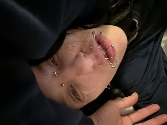 A close-up, upward-angled forensic view depicts the face of an individual, presumed to be located in Sofia, Bulgaria. The subject's head is tilted to the viewer's right, with the mouth open, revealing teeth and a heavily pierced tongue adorned with multiple spherical barbells. The lips are extensively modified with various silver-toned metal piercings: the lower lip features at least three prominent circular barbells with spiked ends, alongside spherical studs. The upper lip also presents spherical studs. Multiple dermal piercings are visible on the face; these include spherical studs on the left cheek (subject's right) and near the outer corner of the right eye (subject's left), and a flat disk stud on the left cheek (subject's right). The subject's eyes are open, displaying light-colored irises. Dark hair is partially visible. The individual is clad in dark, possibly navy-blue, fabric, which frames the left side of the face. A fair-skinned hand is visible in the lower right quadrant of the image. The background is dark and indistinct, with a faint suggestion of a patterned fabric on the far right.