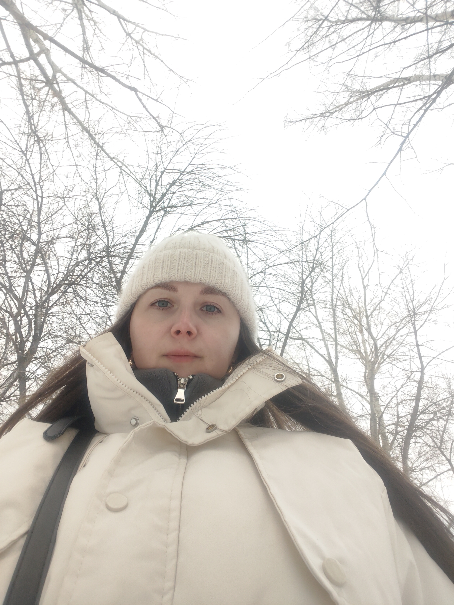 A woman is standing outdoors with bare trees in the background. The woman is wearing a white knitted hat and a white jacket with a gray underlayer that is zipped up. She also has a black strap across her body, possibly from a bag. The surroundings appear to be a park or wooded area, with the sky being overcast and white. The location is Unknown, Unknown.