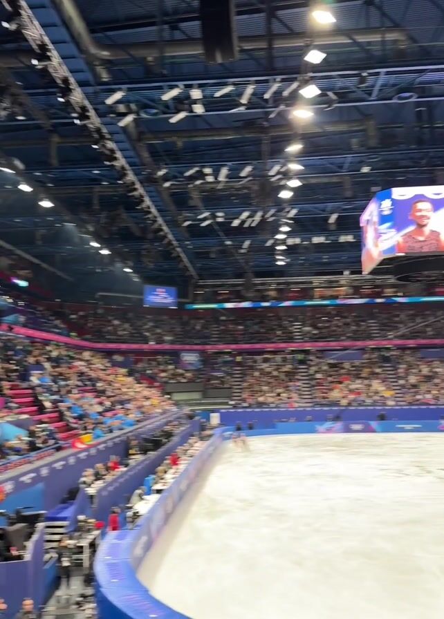 n indoor ice rink packed with spectators. A large screen suspended from the ceiling displays a video of two figure skaters, followed by a group of five individuals. Two skaters are visible on the ice. The building has a blue ceiling structure with many lights. A blue barrier surrounds the ice rink. The seating is tiered and filled with people wearing various colors. There's a small platform on the left side of the rink.