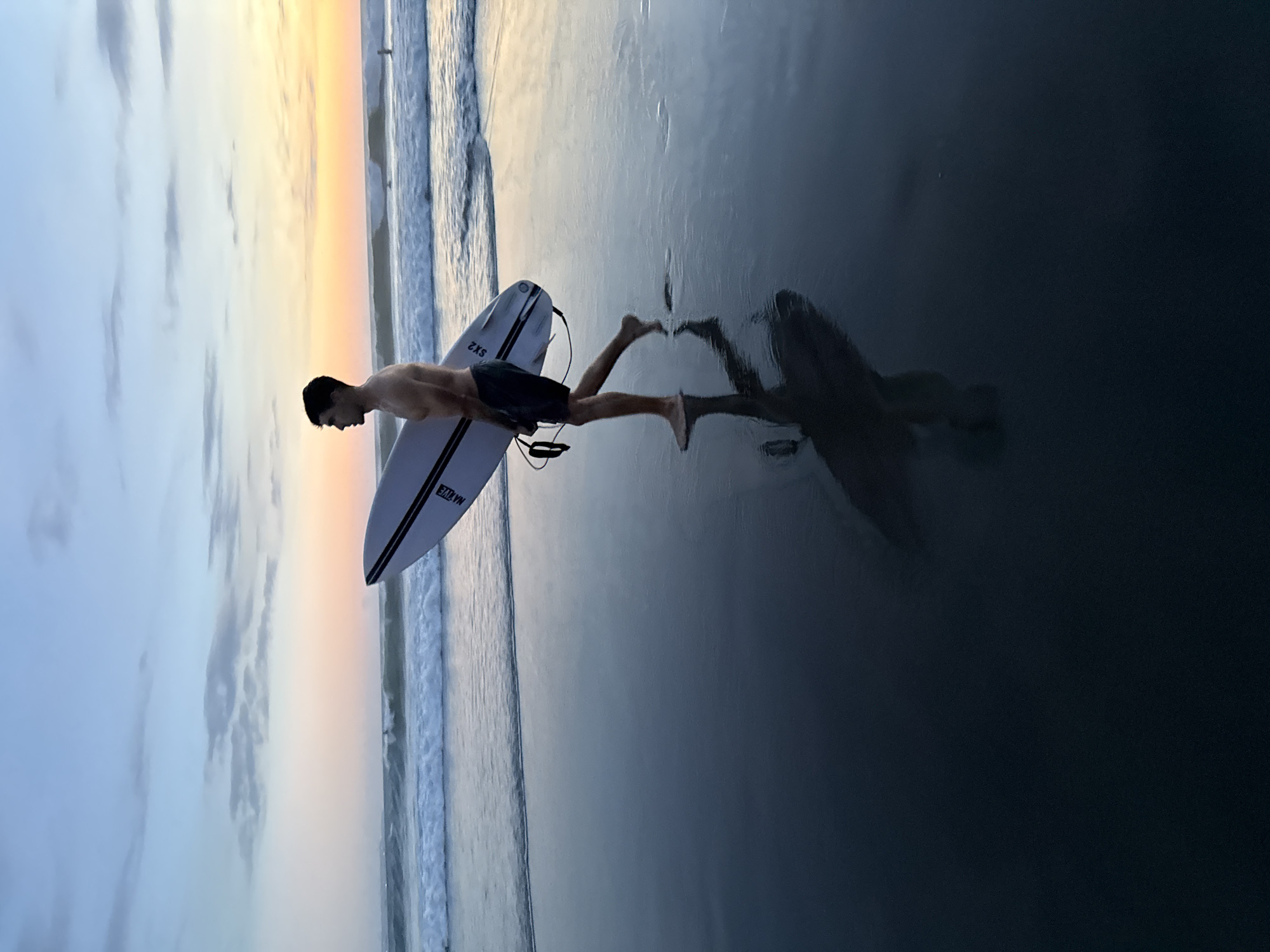 A sideways shot shows a man walking along the wet sand of a beach, carrying a white surfboard under his arm. He is reflected in the wet sand. The beach is located in North Kuta, Indonesia, during a sunset, which is visible as a gradient of colors in the sky. The waves of the ocean are near the shoreline, and the sky is cloudy.